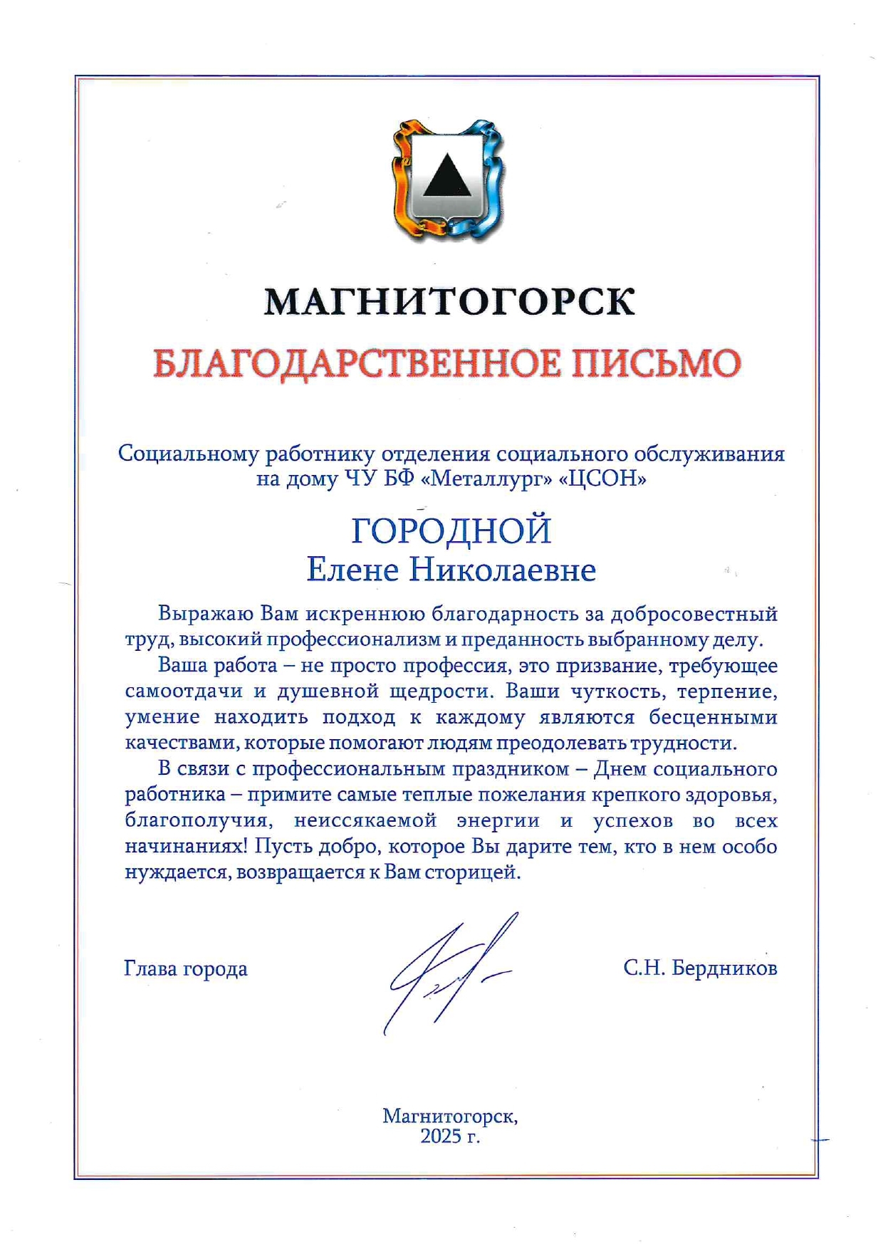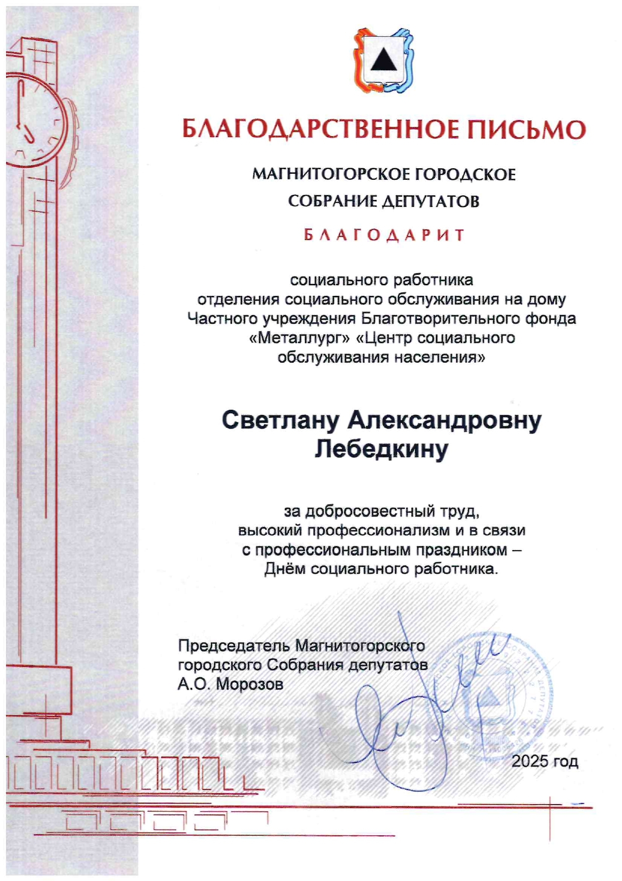 Имеет награды: Благодарственное письмо администрации города Магнитогорска, Благодарственное письмо Законодательного Собрания Челябинской области