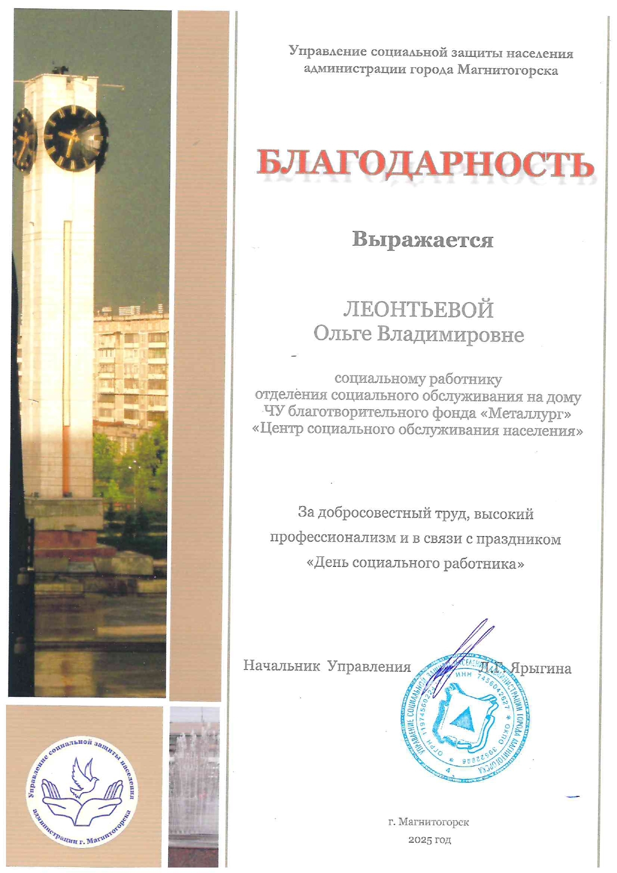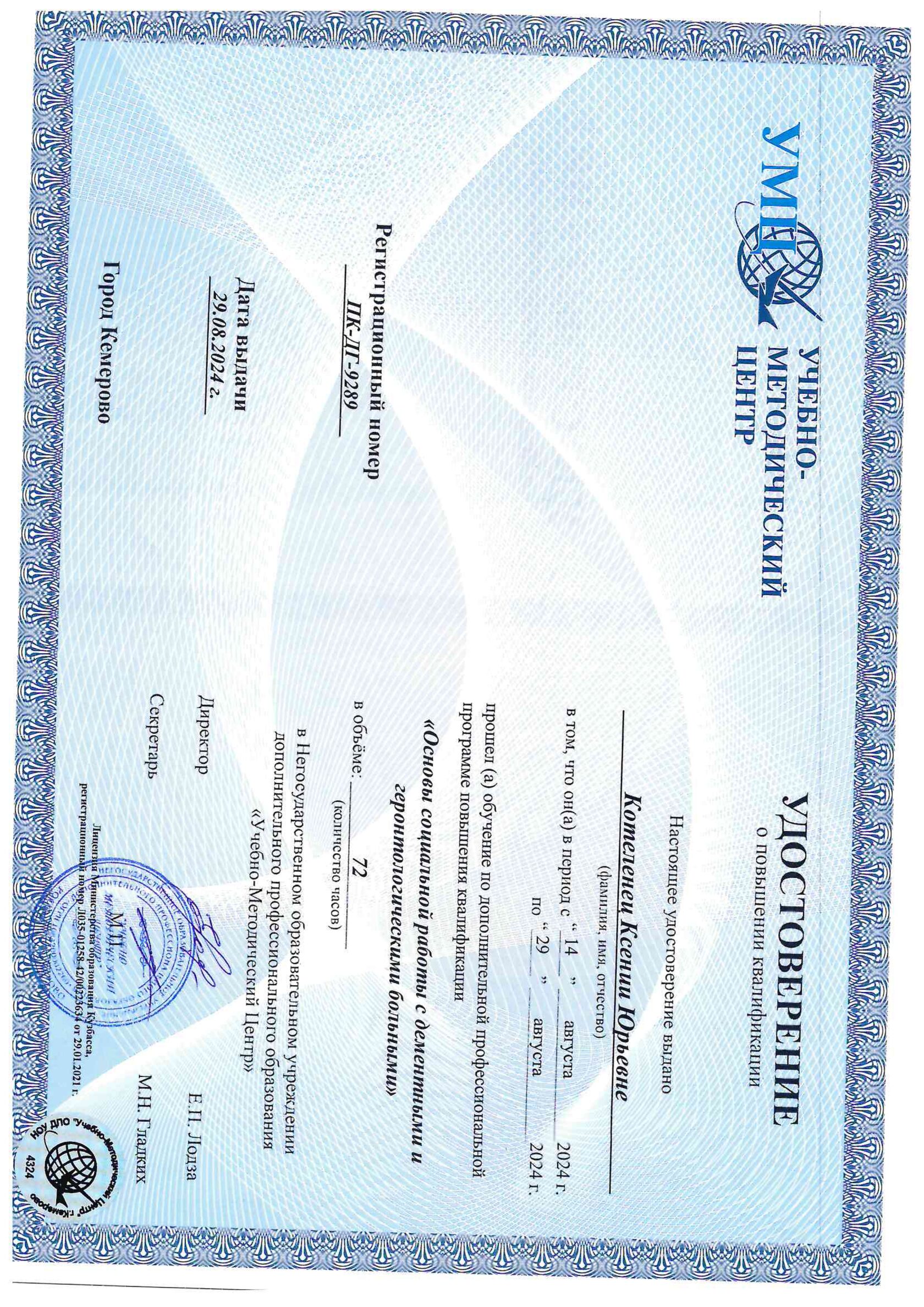 Прошла обучение по программе "Системы долговременного ухода за гражданами пожилого возраста и инвалидами, признанными нуждающимися в социальном обслуживании". Полученные знания подтвердила на практике в 2022 году в отделение паллиативной помощи городской больнице N5 города Челябинска